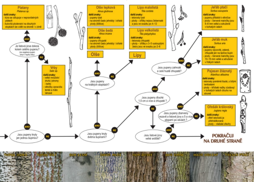 Aby byl klíč jednoduchý, jsou v něm obsaženy pouze běžné tuzemské druhy, cizokrajné stromy tam nenajdeš. Klíč tě vede postupně krok za krokem k určení druhu stromu. Všechny otázky jsou graficky znázorněny, takže postupuješ po stránkách klíče podle jednoduchého diagramu.