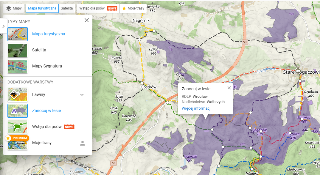 Pro snadné plánování a hledání vhodných oblastí se hodí interaktivní mapa na Mapa-Turystyczna.pl. V menu si můžete zapnout vrstvu „Zanocuj w lesie“ a na mapě se zobrazí vyhrazené lokality. Kliknutím na konkrétní oblast se dostanete k detailům a odkazům na příslušné nadleśnictwo, kde jsou často vyznačená i místa, kde je povoleno rozdělávání ohně.